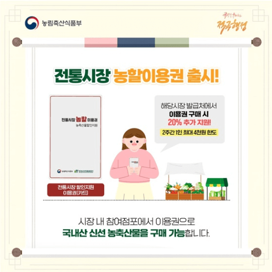 • 해당 전통시장에 방문해 이용권을 발급받으면 20%의 추가 지원금이 충전되어 국내산 신선 농축산물 구매 시 사용할 수 있습니다.