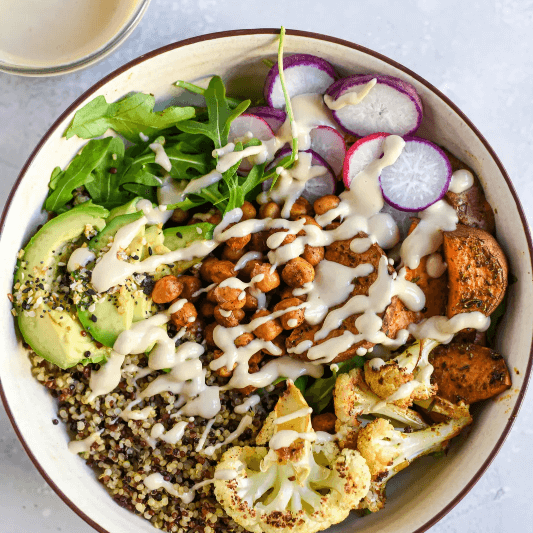 삶은 카무트를 신선한 채소와 곁들이면